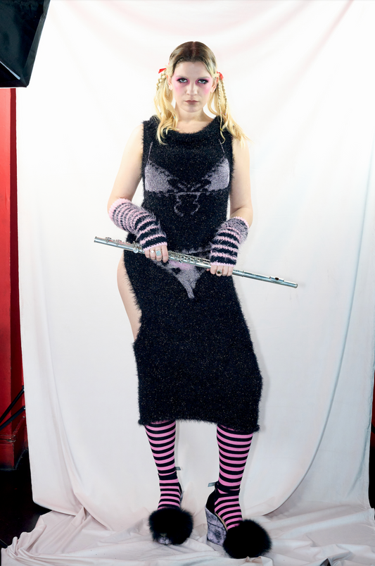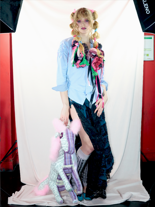 combines used materials, knitwear, funky prints and nostalgia to unravel the power of folklore and traditional handicraft as weaponry in the fight for women’s rights.
